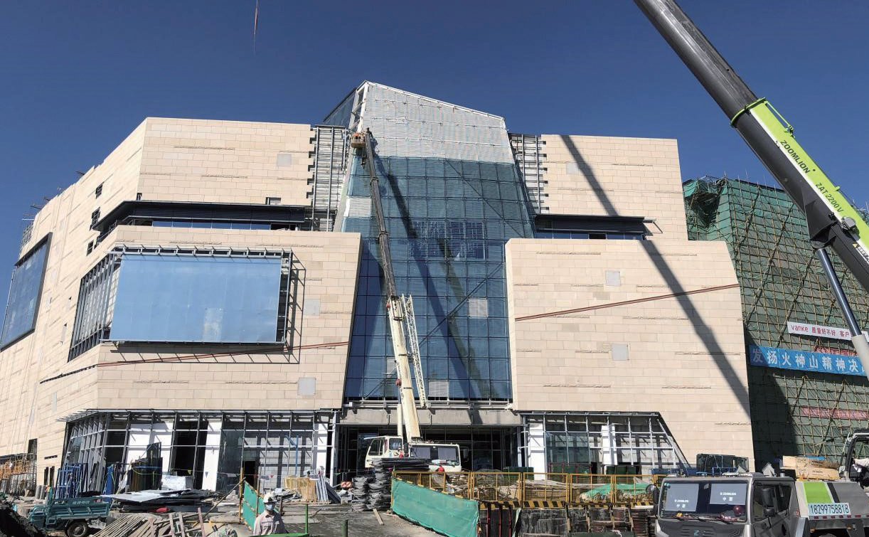 在整個幕墻系統(tǒng)安裝施工中,面積最大的部分是石材幕墻系統(tǒng),它是突出整體建筑效果的基礎(chǔ),為完美呈現(xiàn)項目的地域特點和建筑氣勢,凸顯民族工藝細(xì)節(jié),前期的選礦環(huán)節(jié)尤為重要,港源幕墻項目部組織業(yè)主親臨礦山開展實地考察,根據(jù)不同石材特性和施工需求進(jìn)行分析論證,最終決定采用產(chǎn)自烏魯木齊本地的卡拉麥?zhǔn)淖鳛槟粔τ昧稀J┕とA段十分注重石材防護(hù),材料出廠前由項目組對石材進(jìn)行六面防護(hù)措施檢查,其中,防護(hù)劑的使用降低了酸雨對石材的浸入。石材掛裝完畢后再由專業(yè)人員對石材表面進(jìn)行清洗維護(hù),嚴(yán)謹(jǐn)?shù)姆罎B防污措施能有效避免成品損壞或墻體污染,保證了幕墻施工質(zhì)量和最佳展示效果。