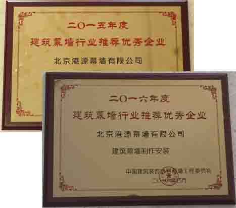 2016年4月,經(jīng)中國(guó)建筑裝飾協(xié)會(huì)幕墻工程委員會(huì)的專(zhuān)家聯(lián)合評(píng)審,港源幕墻榮獲“建筑幕墻制作安裝推薦優(yōu)秀企業(yè)”,這是港源幕墻連續(xù)兩年獲得該項(xiàng)殊榮,充分體現(xiàn)行業(yè)專(zhuān)家對(duì)港源幕墻專(zhuān)業(yè)技術(shù)的認(rèn)可。